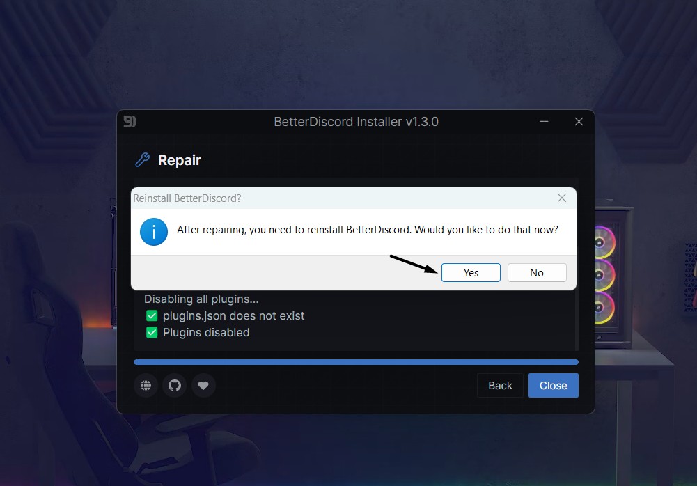 5.Vous verrez maintenant que le processus de réparation BetterDiscord a commencé. Pendant le processus, il vous sera demandé de réinstaller l'application BetterDiscord, alors cliquez sur le boutonOuibouton pour le réinstaller sur votre PC.