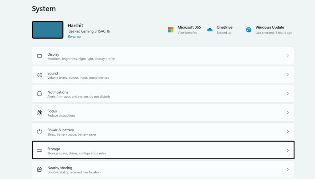 1.Ouvrez leApplication Paramètressur votre PC Windows 11 et cliquez sur le boutonStockageoption sousSystème.