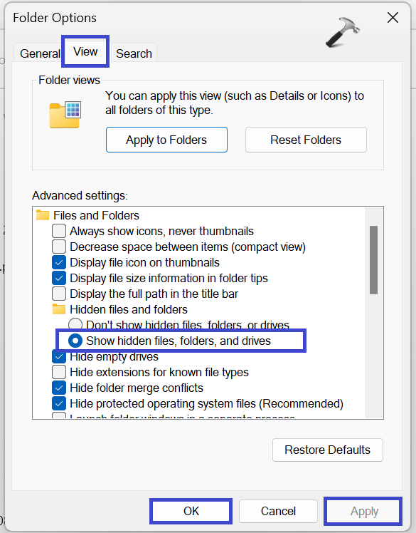 2. Dans leOptions des dossiersfenêtres, allez dans leVoirsection.