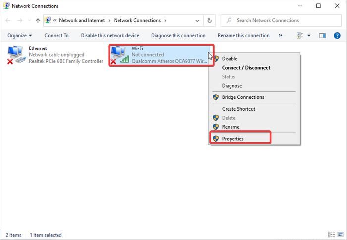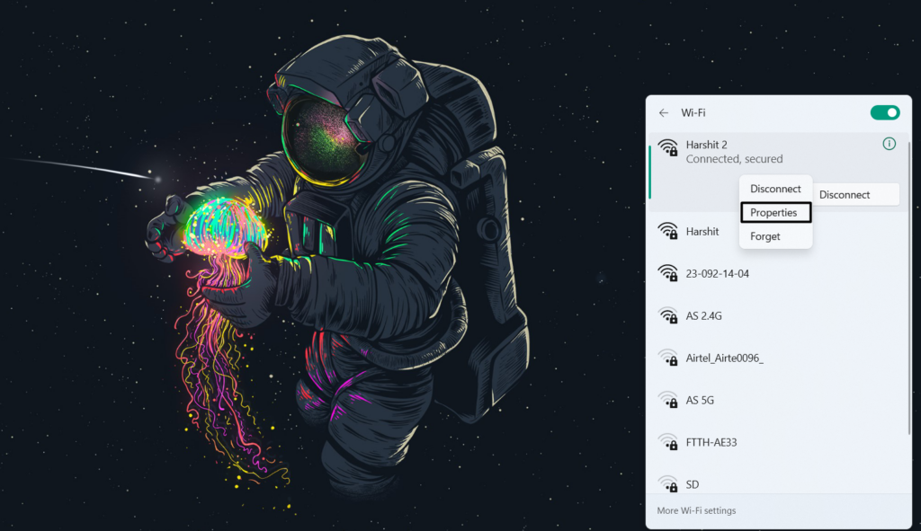 3.Sur l'écran suivant, faites un clic droit sur votre réseau Wi-Fi et choisissezPropriétésdu menu.
