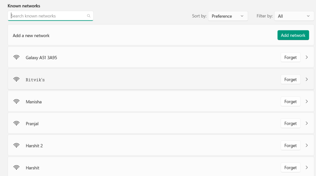 4.Cliquez sur leOublierà côté du réseau Wi-Fi pour supprimez le réseau de votre système.
