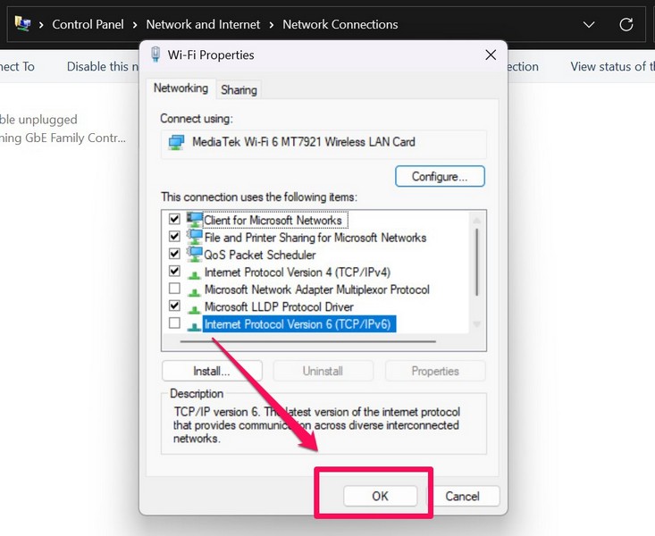 Vous ne le savez peut-être pas, mais l’option IPv6 n’a pas vraiment besoin d’être activée sur le PC pour que le Wi-Fi fonctionne correctement. Mais le garder activé entraîne parfois l’erreur « Impossible de se connecter à ce réseau ». Il est possible que cela soit activé sur votre PC, c'est pourquoi ce problème apparaît. Ainsi, nous vous proposonsassurez-vous qu'il est éteinten essayant les étapes ci-dessous :