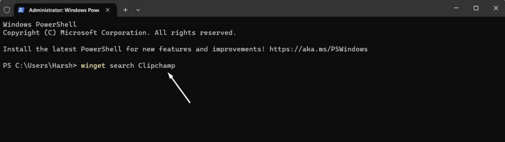 3.Tapez lerecherche d'ailes Clipchampcommande dans la console et appuyez surEntrerpour l'exécuter.