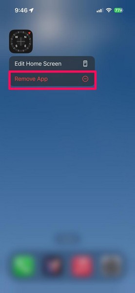 2. Appuyez et maintenez l'icône de l'application Compasspour afficher le menu contextuel et sélectionner leSupprimer l'applicationoption.