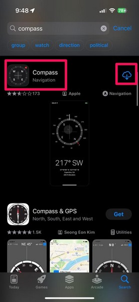 7.Localisez leApplication Boussoledans les résultats de recherche et appuyez sur leBouton de téléchargement(nuage avec une flèche vers le bas) à côté.