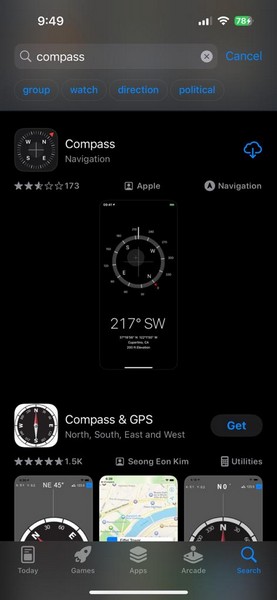 Par conséquent, si vous continuez à rencontrer des problèmes avec l'application Apple Compass sur votre iPhone, vous pouvez passer à n'importe quelle autre application Compass tierce sur votre iPhone. Vous pouvez simplement accéder à l’App Store et rechercher « Boussole » via l’onglet Recherche. Ensuite, parcourez la multitude de résultats pour trouver l'application Compass parfaite pour remplacer l'application iOS Compass sur votre iPhone.