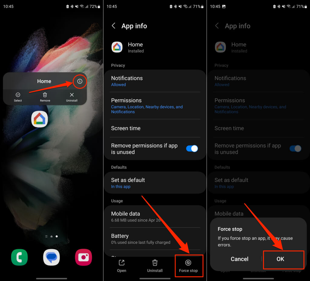 Effacer les données du cache d'une application défectueuse peut permettre à l'application de fonctionner à nouveau correctement. Si vous obtenez l'erreur « Impossible de communiquer avec votre Chromecast » sur un appareil Android, forcez la fermeture de l'application Google Home et effacez ses données de cache.