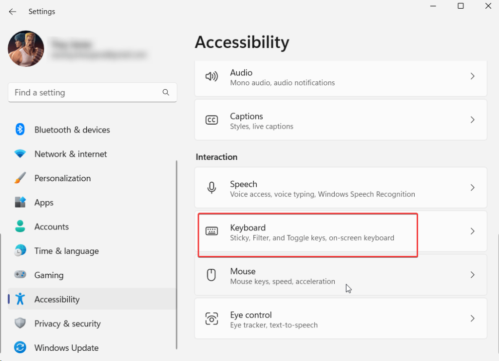 Étape 2 –Cliquez surFacilité d'accès > Clavier > Utiliser les touches rémanentes