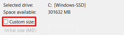 6.Une fois terminé, sélectionnez le stockage de votre ordinateur dans la liste et cochez la caseTaille personnalisée :boîte.