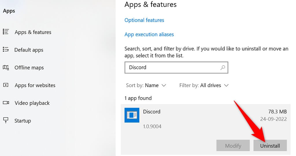 - ChoisirDiscordedans la liste, puis sélectionnezDésinstaller.