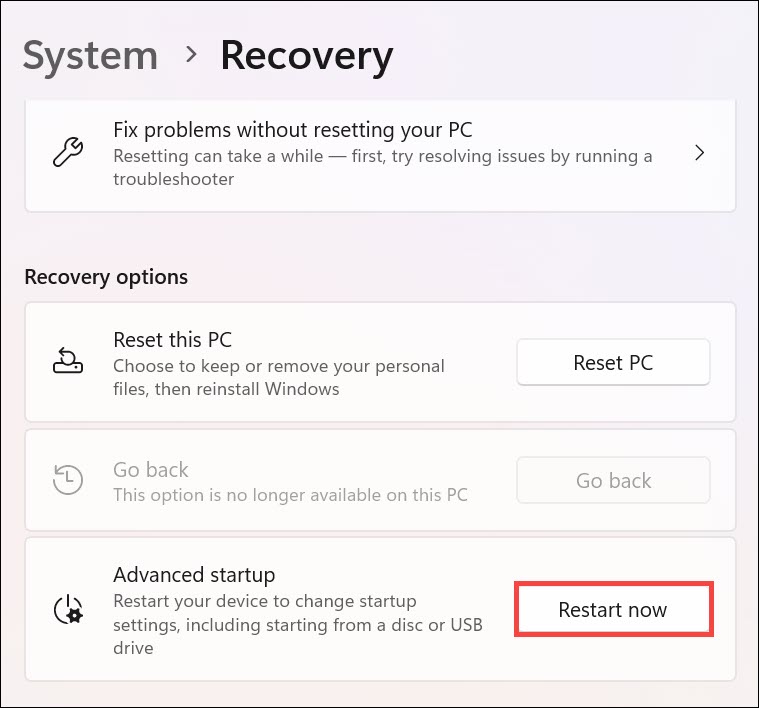 1.Allez auRécupérationsection de laApplication Paramètreset cliquez sur leRedémarrez maintenantbouton à côté deDémarrage avancé.