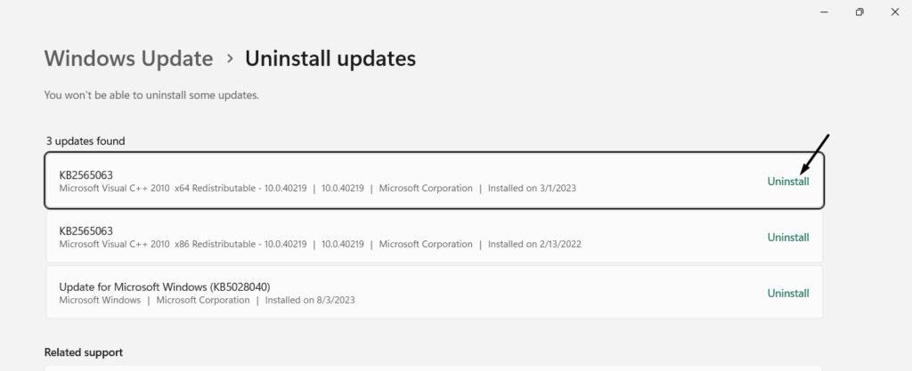 3.À côté de la mise à jour conflictuelle, cliquez surDésinstalleret encore une fois, choisissezDésinstallerpour le désinstaller.