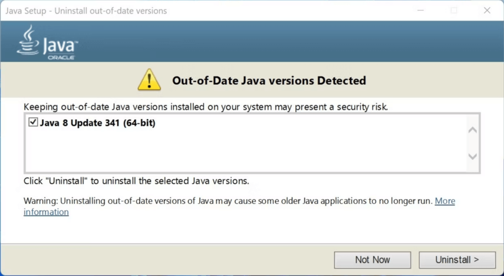 Note:Si par hasard le processus d'installation détecte une version Java obsolète, cliquez sur Désinstaller pour la supprimer.