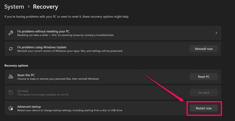 3.Ici, cliquez sur leRedémarrer maintenantbouton à côté duDémarrage avancéoption.