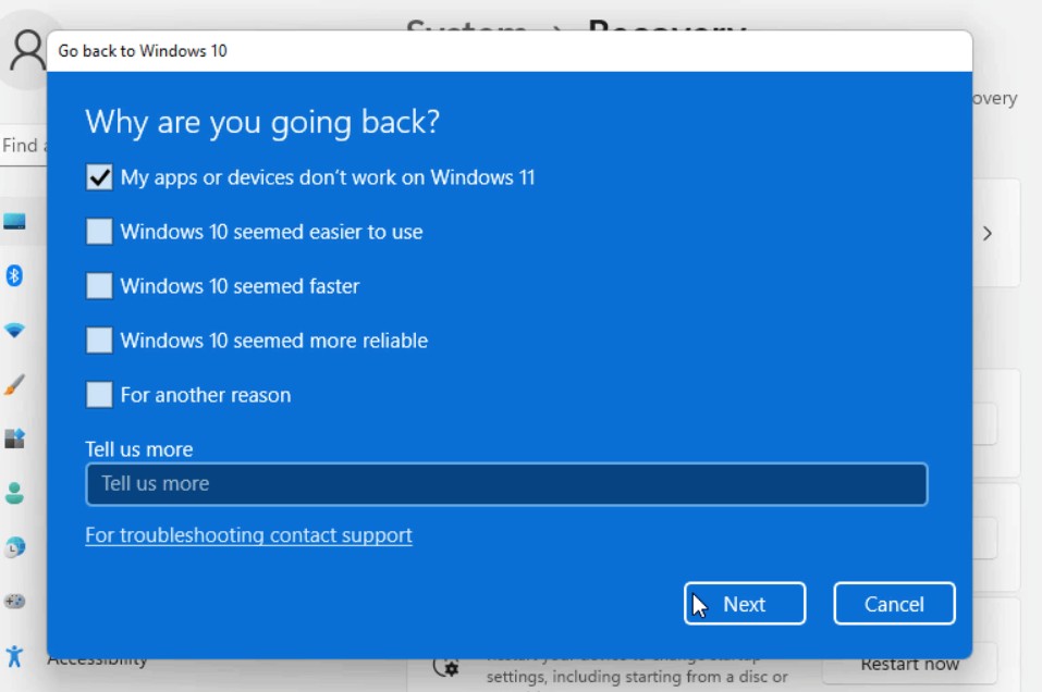 Pour certains utilisateurs, leur imprimante HP a cessé de fonctionner après la mise à niveau de leur PC vers le nouveau Windows 11. Si tel est votre cas, nous vous suggéronsrevenir à Windows 10. Pour faire de même, vous devez utiliser la fonctionnalité Retour en arrière de Windows 11.