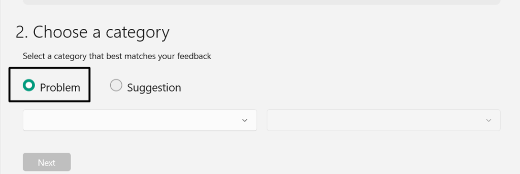 3.Choisissez leSuivantbouton, sélectionnez leProblèmebouton radio, puis choisissez une catégorie de problème.