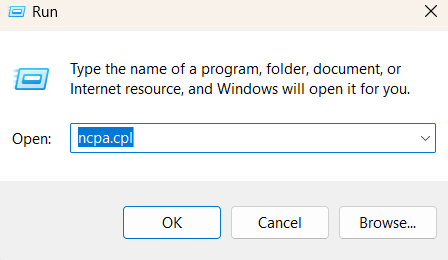 Étape 1 :Appuyez sur leGagner + Rcombinaison de touches pour ouvrir leCourirboîte de dialogue. Taper "Ncpa.cpl" dans la zone de texte et appuyez surEntrer.
