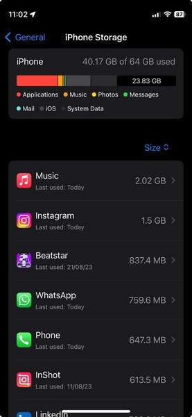 Si vous ne disposez pas de suffisamment d'espace sur votre appareil, vous devez supprimer les applications, médias et autres fichiers de votre iPhone. Vous pouvez également vous rendre auStockage iPhoneparamètres via leGénéralpage des paramètres dans l’application Paramètres et suivez les suggestions de suppression de stockage recommandées pour libérer de l’espace pour la mise à jour iOS 17.