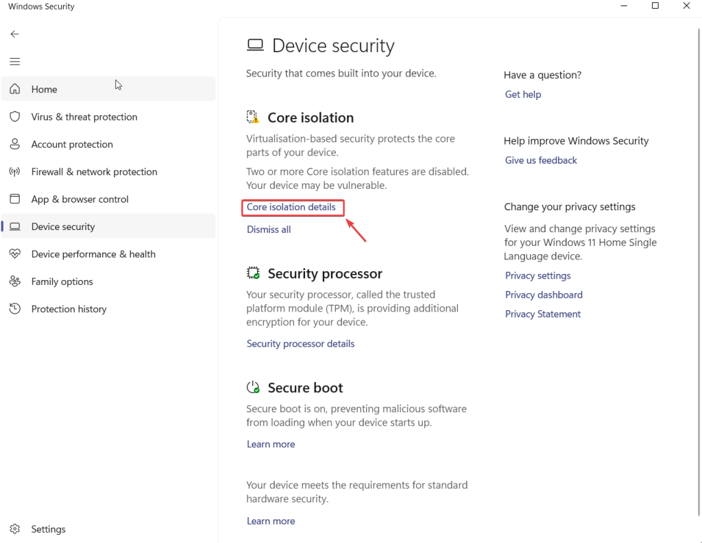 Étape 3 –Dans la partie droite, cliquez surDétails de l'isolation principalesousIsolation du noyau.