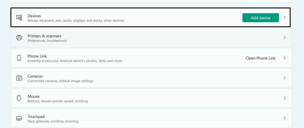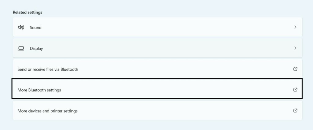 3.Dans leAppareilsécran, cliquez surPlus de paramètres Bluetoothpour ouvrir leParamètres Bluetoothrapide.