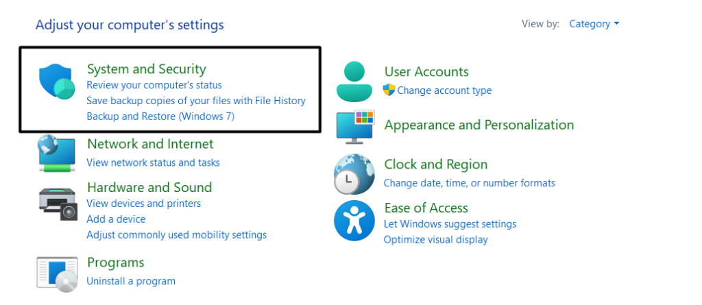 1.OuvrirPanneau de contrôlesur votre PC Windows 11 et ouvrez leSystème et sécuritésection.