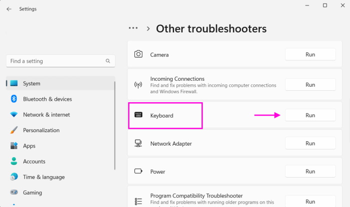 2.Dans la fenêtre suivante, recherchez leClavierdépanneur et cliquez sur leCourirbouton à côté.