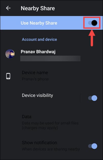 3.Recherchez l’option « Visibilité de l’appareil » et assurez-vous que le bouton à côté est activé. Sinon, appuyez simplement sur la bascule pour l'activer.