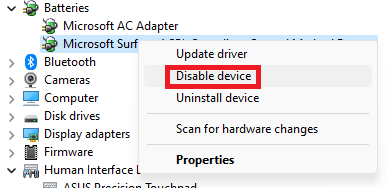 3.Faites un clic droit surMicrosoft Surface ACPI – Batterie conforme à la méthode de contrôleet sélectionnezDésactiver l'appareil.