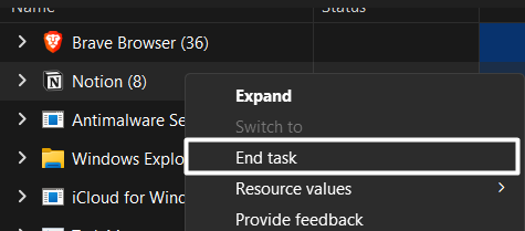 3.Enfin, sélectionnez leFin de la tâcheoption dans le menu pour terminer l'application Notion et éliminer tous les problèmes.