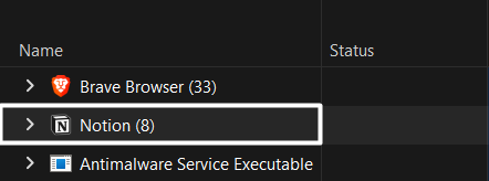 2.SélectionnerGestionnaire de tâchesde laMeilleure correspondancesection et recherchez leApplication Notiondans leProcessuslanguette.