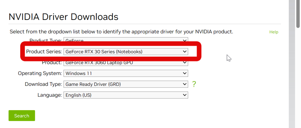 7.Ensuite, cliquez sur le menu déroulant Série de produits et sélectionnez la série de GPU Nvidia que vous possédez.