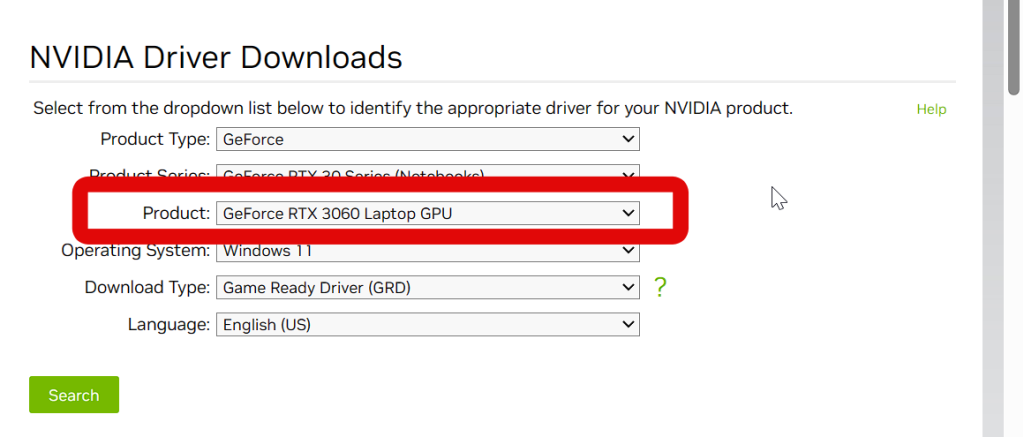 3.Comme ci-dessus, cliquez sur le menu déroulant Produit et sélectionnez votre GPU. Assurez-vous de sélectionner le bon GPU, que vous ayez un ordinateur portable ou un ordinateur de bureau.