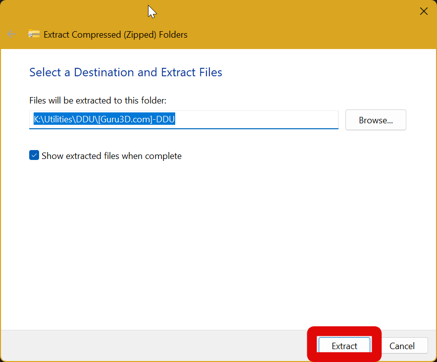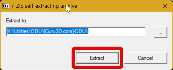 3.CliquezExtrait. Cela extraira l'archive au même endroit. Le dossier extrait s’ouvrira automatiquement une fois le processus terminé. Une fois extrait, double-cliquez et lancez le fichier DDU.exe, qui devrait également avoir la version actuelle incluse dans le nom du fichier.