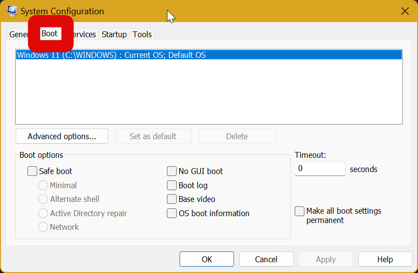 8.Cliquez sur l'onglet Boot en haut de la fenêtre.