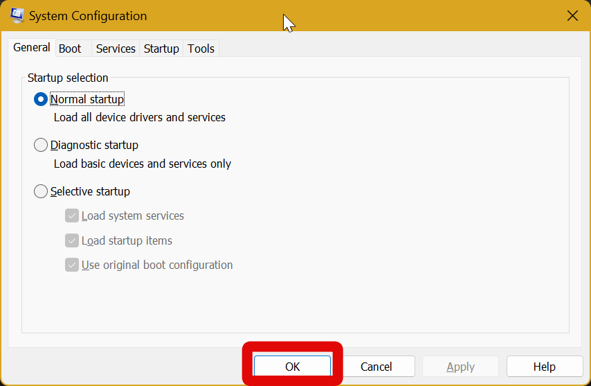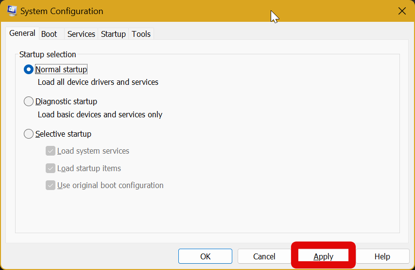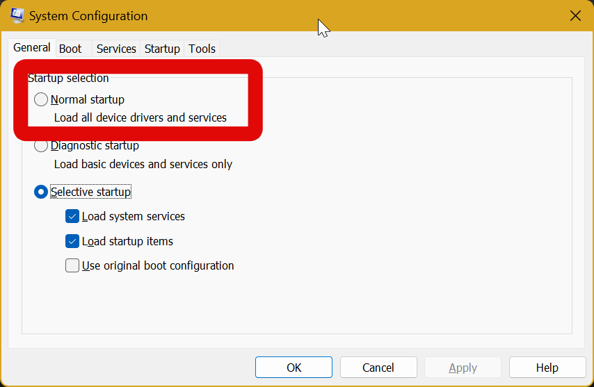 20.SélectionnerDémarrage normalen cliquant dessus.