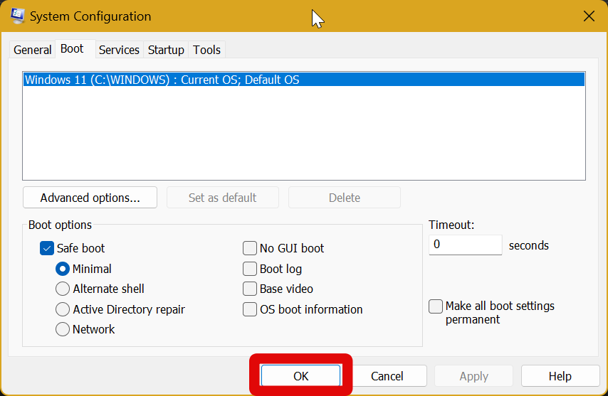 9.Cochez la case Safe Boot sous Options de démarrage en bas.