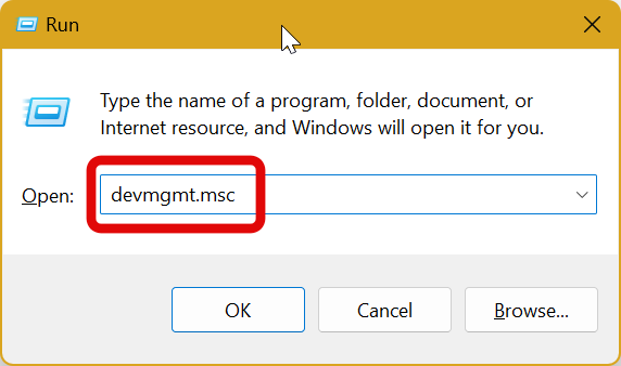 2.Une fois l'application Exécuter ouverte, tapez devmgmt.msc et appuyez sur Entrée sur votre clavier. Vous pouvez également cliquer surD'ACCORDsi vous préférez.