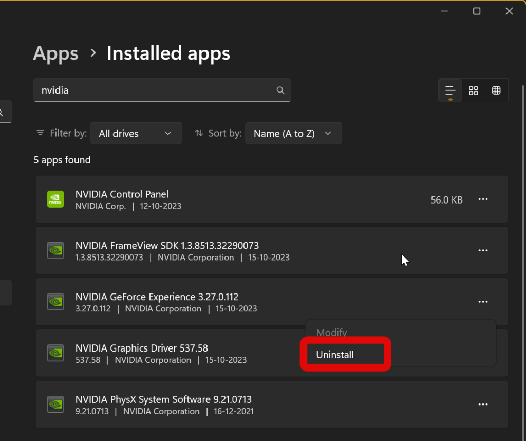 Je vous recommande maintenant de désinstaller GeForce Experience puis d'installer les pilotes sur votre PC. Il se peut que l'expérience GeForce interfère toujours avec l'installation manuelle des pilotes sur votre PC.