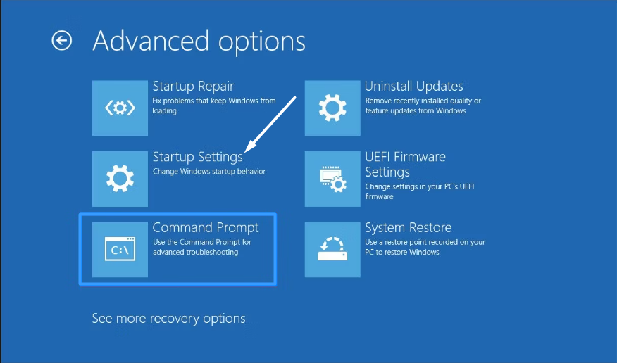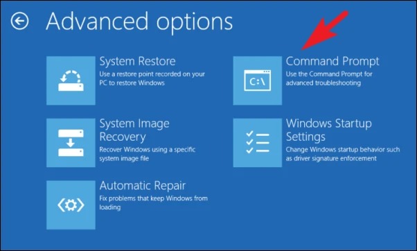 3.Dans leOptions avancéessection, cliquez sur leInvite de commandeoption pour ouvrir l’utilitaire d’invite de commande et y exécuter la commande ci-dessous.