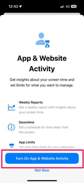 5.Sur l'écran de démarrage suivant, appuyez sur leActiver le bouton Activité des applications et des sites Webpour activer la fonction Screen Time sur l'appareil.