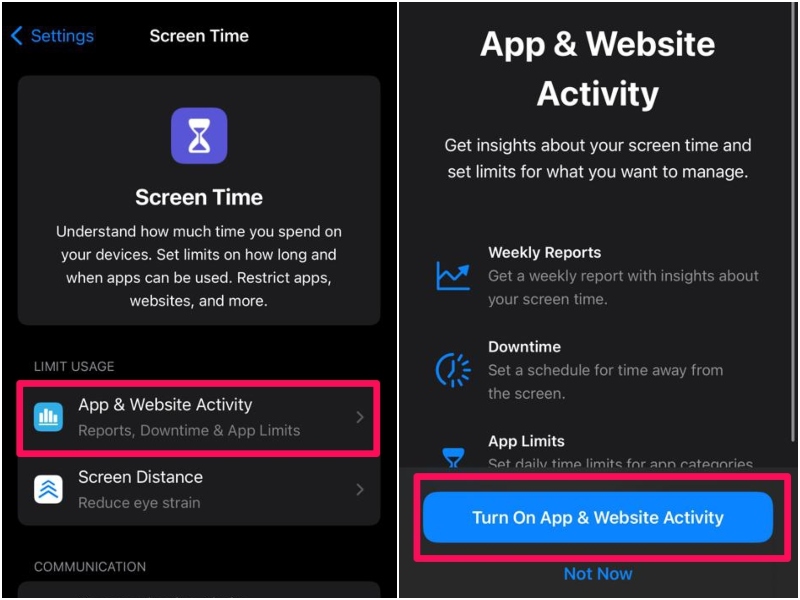 Ainsi, si vous souhaitez réactiver Screen Time après avoir modifié les paramètres de date et d'heure sur votre iPhone, vous pouvez simplement ouvrir leTemps d'écranpage des paramètres, appuyez sur leActivité sur les applications et les sites Weboption en vertu duLimit Usagesection, etconfirmez votre action sur l'écran de démarrage suivantpour réactiver la fonctionnalité.