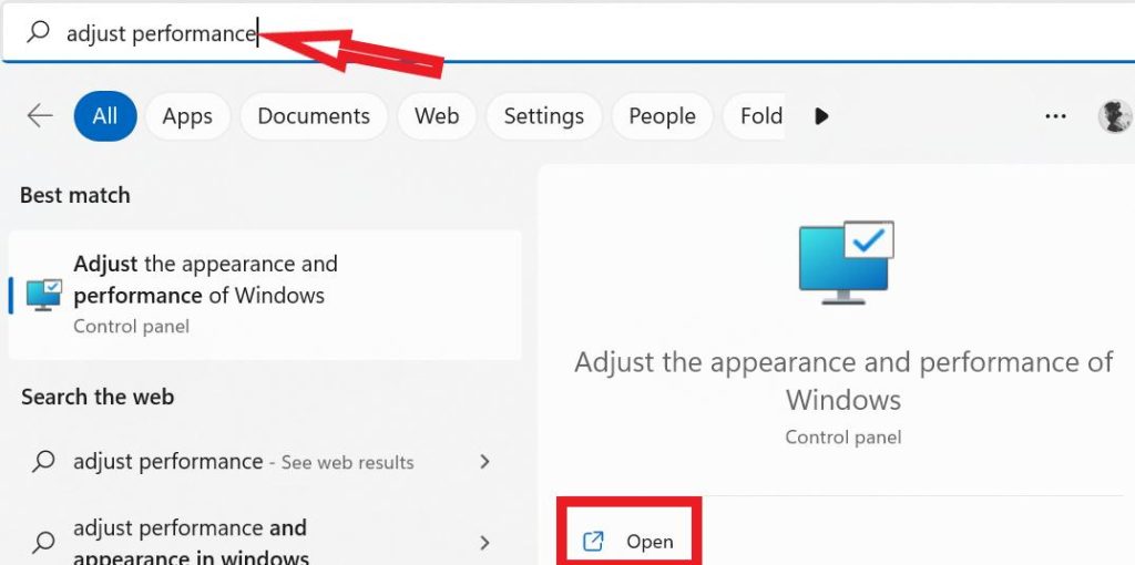- Cliquez sur l'icône de recherche et tapezajuster les performanceset ouvrez la toute première suggestion.