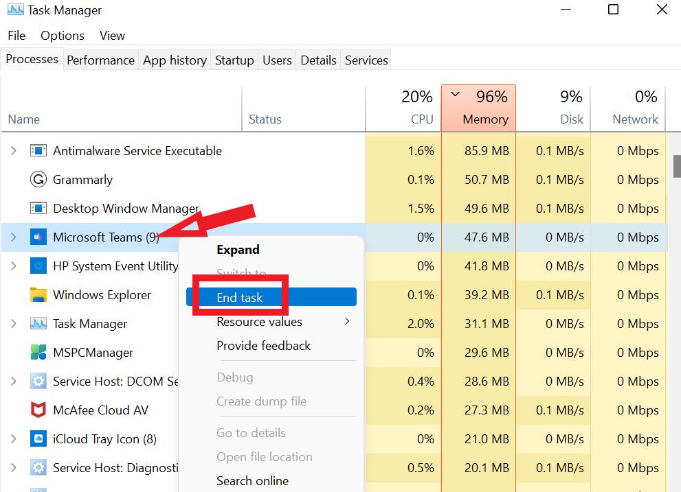 - Clic droitsur l'application/le processus que vous souhaitez mettre fin et choisissezFin de la tâche.