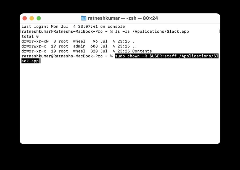 Si le problème persiste, il est temps de modifier la propriété de l’application Slack sur votre MacBook. Cela se produit lorsque /Applications/Slack.app appartient à la racine et non à l'utilisateur. Vous pouvez simplement utiliser la commande chown terminal pour modifier la propriété de l'application en suivant les étapes ci-dessous.
