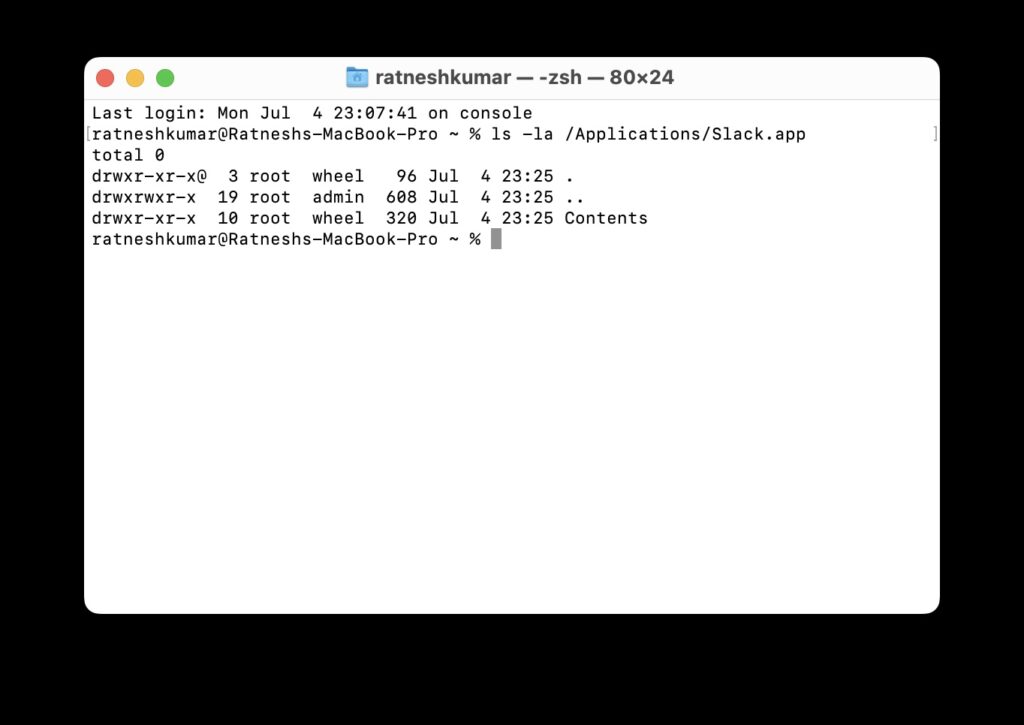 3.Dans la fenêtre du terminal, tapezls -la /Applications/Slack.appet frappéEntrer.