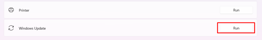 4.Cliquez sur leCourirbouton à côté duMise à jour Windowsdépanneur.