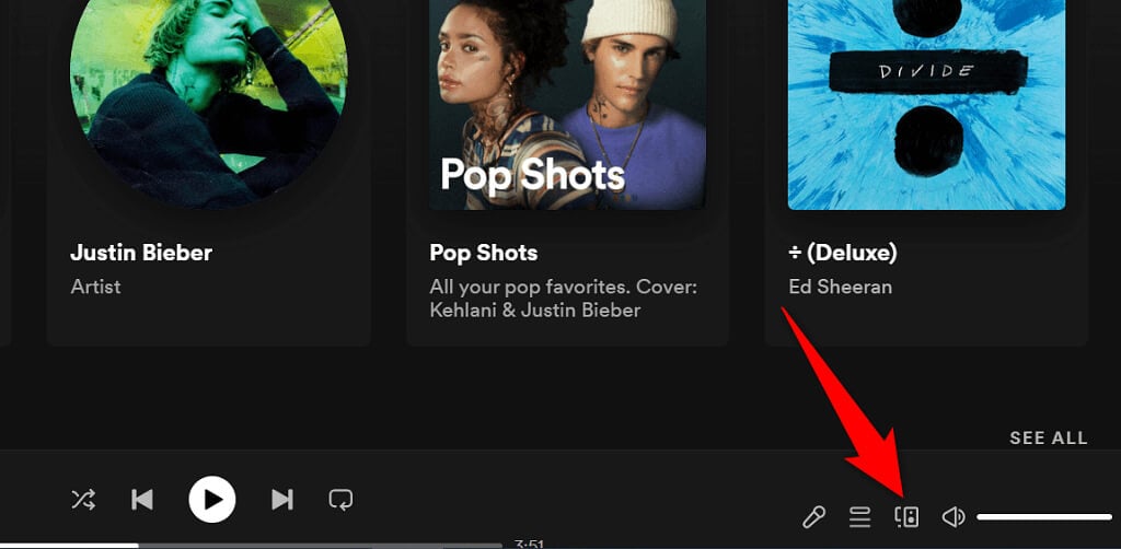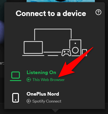 Spotify vous permet de sélectionner manuellement l'appareil sur lequel jouer votre musique. Assurez-vous d'avoir configuré Spotify pour qu'il utilise votre navigateur Web pour la lecture de musique. Si ce n'est pas le cas, changez d'appareil et votre lecteur web commencera à fonctionner.