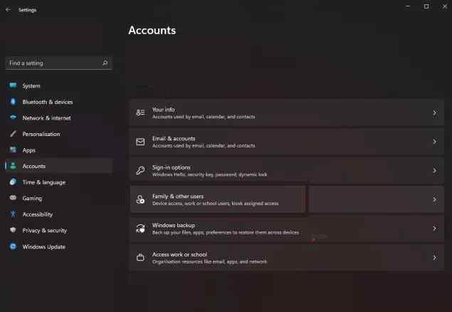 Étape 7 : En supposant que vous disposez de Windows 11, cliquez surComptesà gauche et à droite, cliquez surFamille et autres utilisateurs.
