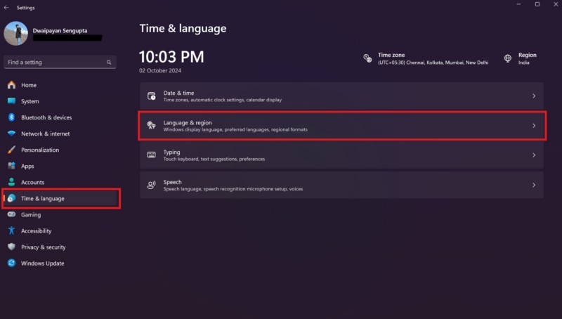 2.Allez auOnglet Heure et languedans la barre de navigation de gauche et cliquez sur leLangue et régionoption dans le volet de droite.