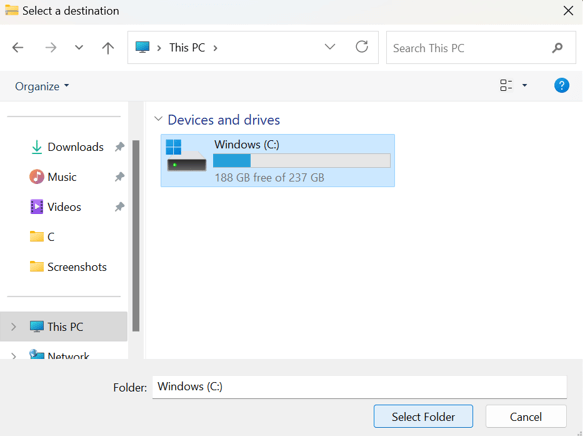 Étape 3 :Cliquez sur le lecteur C via le mini explorateur de fichiers, puis cliquez sur le bouton Sélectionner un dossier.